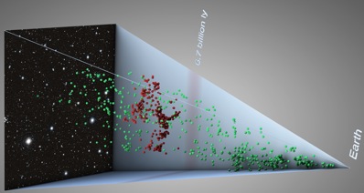 This illustration shows the position of the galaxies and reveals the extent of this gigantic structure. The galaxies located in the newly discovered structure are shown in red. Galaxies that are either in front or behind the structure are shown in green. Image: ESO/L. Calçada/Subaru/National Astronomical Observatory of Japan/M. Tanaka.