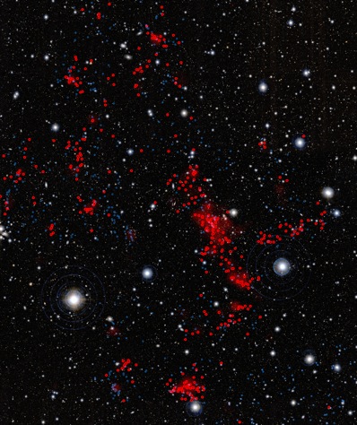 The galaxies located in the newly discovered structure are shown in red. Galaxies that are either in front or behind the structure are shown in blue. Image: ESO/Subaru/National Astronomical Observatory of Japan/M. Tanaka.
