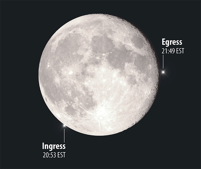 In New York, Regulus is swallowed up on 2 February at 20:53 EST, reappearing at 21:49. Credit: Astronomy Now/Greg Smye-Rumsby