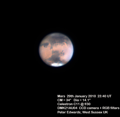 Andrew Foster of the Netherlands made this movie of Mars in one night from 21:45 to 01:00 on 26-27 January after reading our Mars special issue, using a Celestron CPC800 on a fork mount, with 2 x barlow and Celestron Neximage camera. He says, "I took image sequences of 1200 frames each at 15 minute intervals for 3 1/4 hours, until battery died in the cold. I processed each image sequence with Registax 5, saved as jpgs then aligned / centered with Photoshop CS3. It took ages to do all the processing, especially for a 7 second animation, but I'm really pleased with the result! You can see the North polar cap (bottom right on the image), with I think Mare Acidalium and Sinus Sabaeus above (to the south). Also you can see the effect of the altitude increasing over the night, as Mars clears the atmospheric murk and the image becomes sharper."