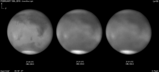 Above: Ian Sharp's images of Mars showing bright Olympus cloud and the north polar cap. More of Ian's images at: http://www.astro-sharp.com/mars2010.asp.
