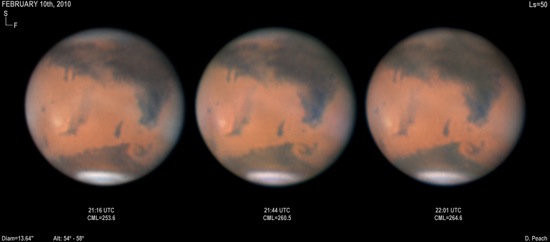 Above: Bruce Kingsley's images. He says, "The seeing was reasonable, improving later in the session to very good indeed. I imaged over a five hour period and observing the steady brightening of Nix Olympica was fascinting. During this session I guess the temperature reached aproximately -5 degrees but the visual was easily the best I have seen Mars this apperition." More of Bruce's images can be seen here.