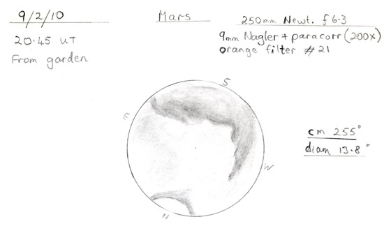 Above: David Cartlidge of Stoke-on-Trent made this Sketch of Mars. His notes: Clear cold night with light patchy cloud, becoming colder with frost forming. Seeing variable but good at this time (II-III). Major features well defined. Syrtis Major appearing long and thin, foreshortened near w limb. Mare Tyrrhenum and Mare Cimmerium stretching across southern hemisphere. Hesperia just visible as a lighter division between Tyrrhenum and Cimmerium. N polar cap very bright against the dark collar.