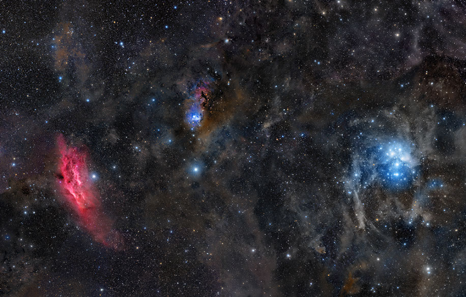 Known since ancient times as the Seven Sisters, the Pleiades Cluster, to the right of the image consists of around a thousand stars, which formed together about 100 million years ago. This unusual view shows the Pleiades Cluster in the broader context of its local environment, drifting through a chaotic region of dark dust. The glowing cloud of hydrogen gas to the left of the image is the California Nebula, named for its resemblance to the US state.