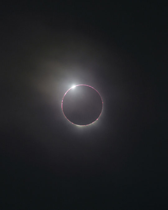 Many features of the Sun only become apparent during a total eclipse, when the Moon blocks the dazzlingly bright star from our view. This image depicts the Sun’s atmosphere as a diffuse white haze, and further in the Sun’s atmosphere appears in the red light of hydrogen. The photographer has captured the moment when a tiny part of the Sun’s disc shines out between the mountains on the edge of the Moon’s disc, creating an effect known as the ‘diamond ring’.