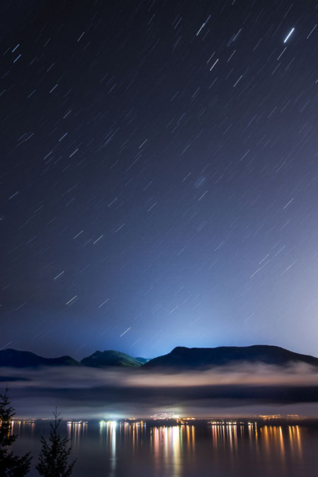 Captured as the year changed from 2013 to 2014, the juxtaposition of the very still land against the circular movement of the stars in the sky around a central point (the pole star) creates a magnificent contrast to this image. Looking closely at the light coming from each of the stars we can see different colours which are incredibly useful for their study. The different colours tell us about what stage of life the stars are a: hot blue stars are young whereas red stars are nearing the end of their lives.