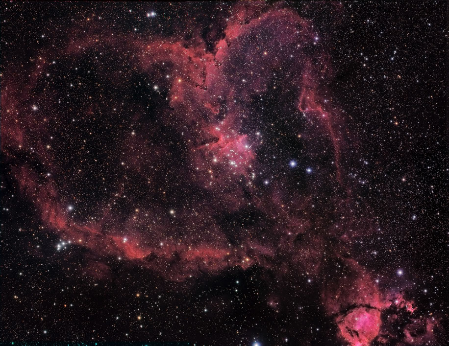 The Heart Nebula is an emission nebula that lies 7500 light years away in the constellation Cassiopeia that takes its name from its resemblance to a heart. The centre of the nebula is illuminated by the open cluster Melotte 15.