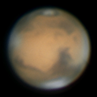 To the naked eye Mars looks like a red star, but with a large enough telescope and the appropriate image post-processing, the true face of the planet is revealed. This image contains the polar ice caps of the planet, dust storms on the left and right sides, and the predominantly orange-brown colour of the surface. The surface gets its signature colour from a thin layer of iron oxide – more commonly known as rust.