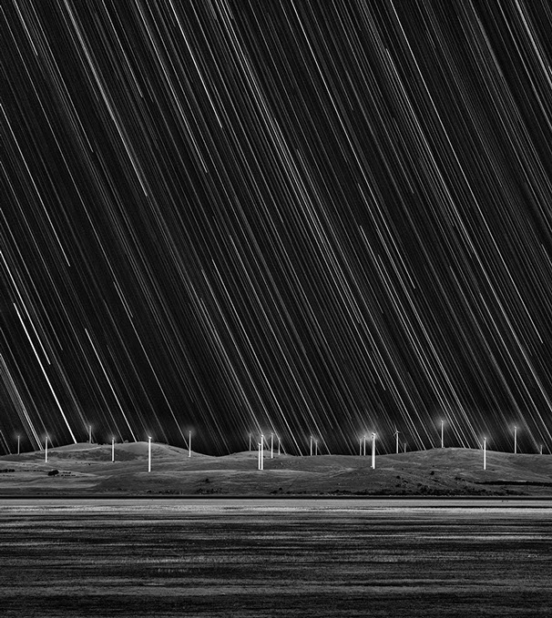 Taken in Australia near the town of Bungendore, this image captures the Capital Wind Farm on the shore of Lake George. The striking monochromatic composition depicts the power of the wind along with the motion of the sky, illustrated by the shower of stars transforming into trails as the Earth rotates.
