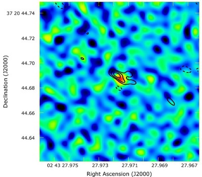 Initial e-VLBI detection of SN 2007gr with the EVN on 6-7 September 2007 (colours). The EVN and Green Bank Telescope VLBI image obtained on 5-6 November 2007 is overlaid (contour representation). Image: Z. Paragi, Joint Institute for VLBI in Europe (JIVE).